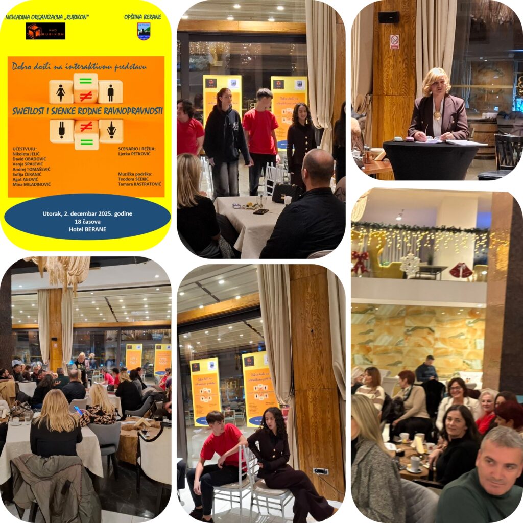 Interaktivna predstava „Svjetlost i sjenke rodne ravnopravnosti“, u okviru projekta koji realizuje NVO „Rubikon“ u saradnji sa Gimnazijom „Panto Mališić“, a pod pokroviteljstvom Opštine Berane, nakon pripreme je izvedena tri puta – 25. novembra 2025. godine u Gimnaziji “Panto Mališić” za učenike Gimnazije, 27. novembra 2025. godine takođe u Gimnaziji za učenike i profesore tri srednje škole, i 2. decembra 2025. godine u Hotelu Berane za širu javnost, odnsno za predstavnike institucija, prosvjetne radnike i ostale građane. Fokus predstave je usmjeren na rodnu ravnopravnosti, rodne stereotipe i ulogu društva u oblikovanju rodnih uloga, a cilj scenarija je bio jasno prikazivanje izazova rodne ravnopravnosti, ali i istovremeno podsticanje publike na refleksiju o tim izazovima i dubljim društvenim dinamikama koje oblikuju živote pojedinca i zajednice.