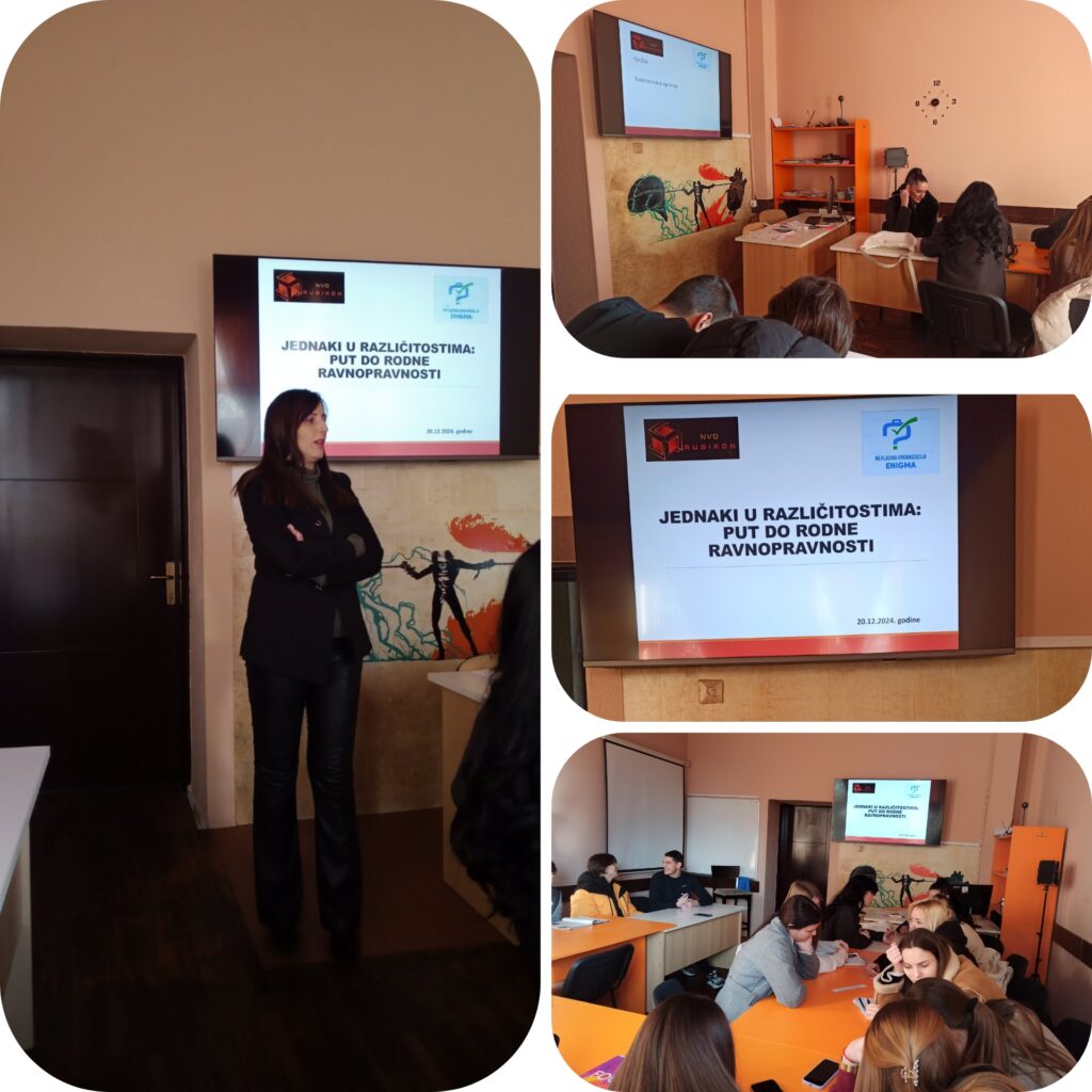 Nevladina organizacija „Rubikon“, u saradnji sa Nevladinom organizacijom „ENIGMA“, realizovala je radionicu na temu rodne ravnopravnosti u petak, 20. decembra 2024. godine. Radionica, pod nazivom „Jednaki u različitostima – put do rodne ravnopravnosti“, održana je u JU Gimnaziji „Panto Mališić“ u Beranama, a učestvovali su učenici četvrtog razreda.